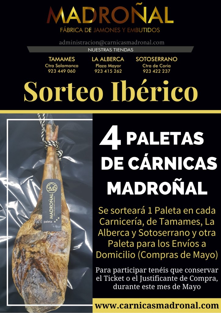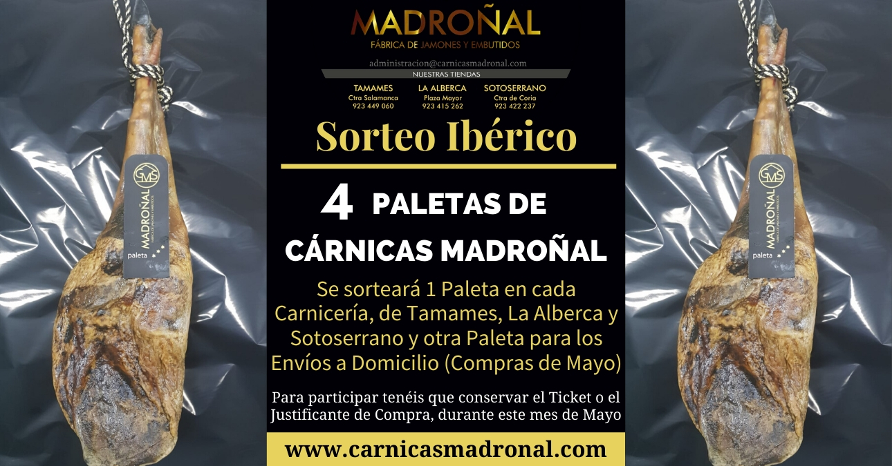 Desde Cárnicas Madroñal sorteamos CUATRO fabulosas PALETAS de CÁRNICAS MADROÑAL, entre nuestros clientes, por sus compras realizadas en Mayo.